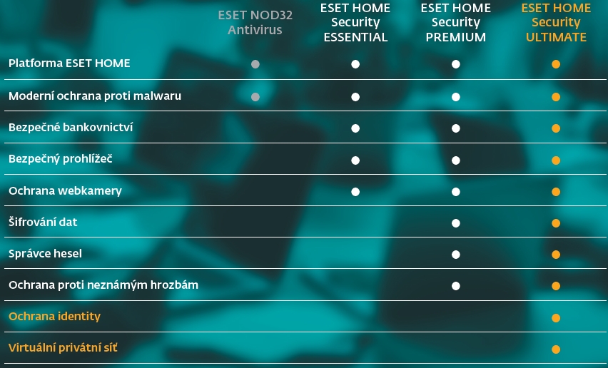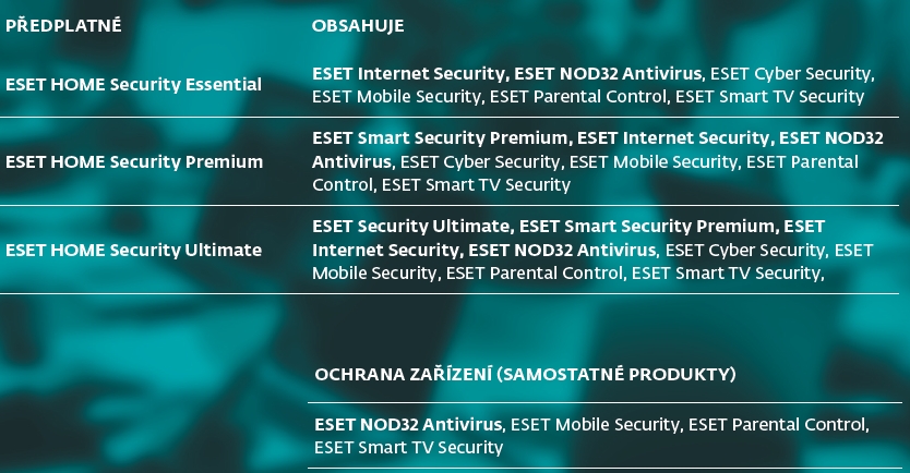 Internet Security, ESET NOD32 Antivirus, ESET Cyber Security, ESET Mobile Security, ESET Parental Control, ESET Smart TV Security. Ochrana identity. Virtuální privátní síť.